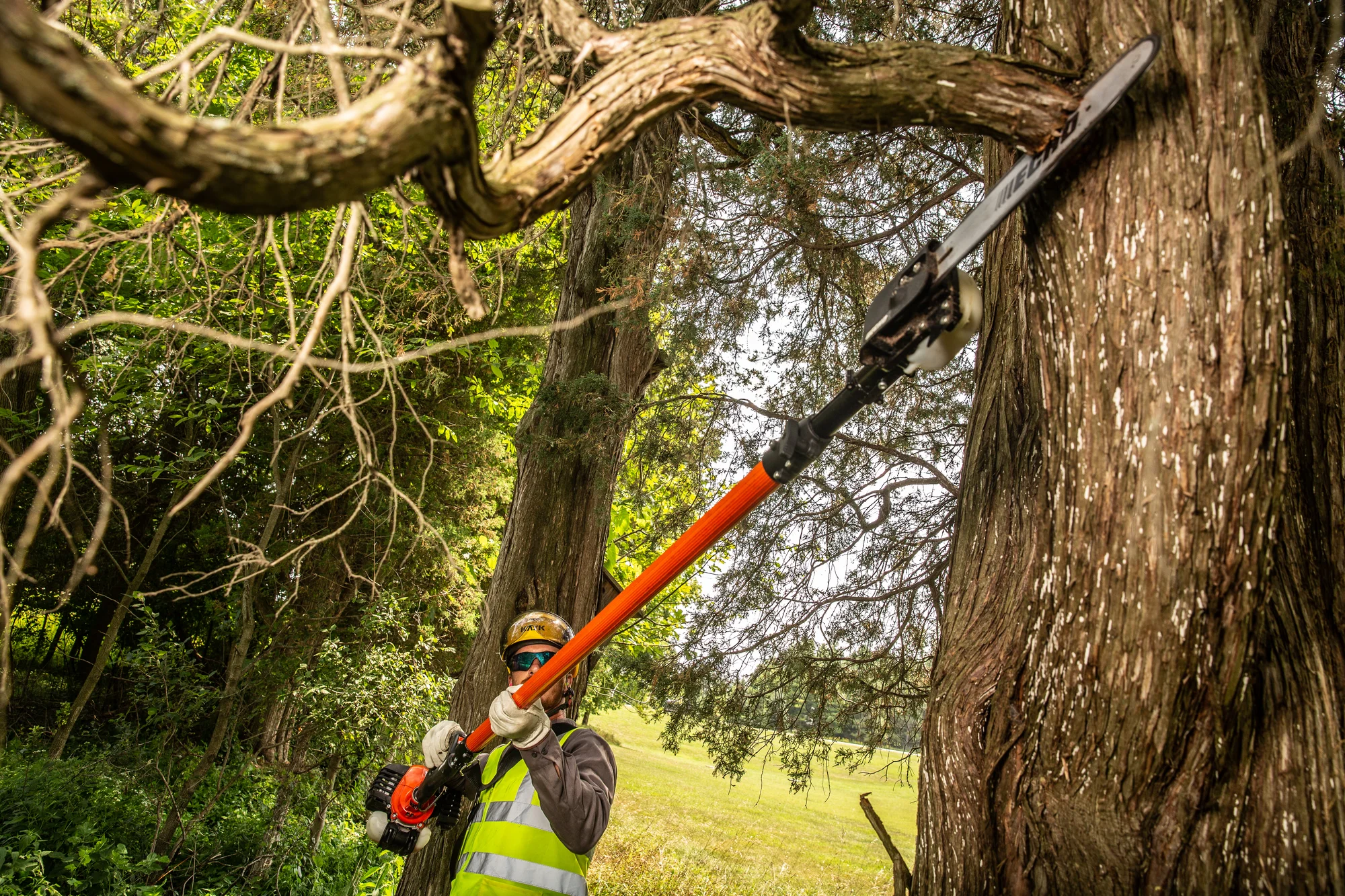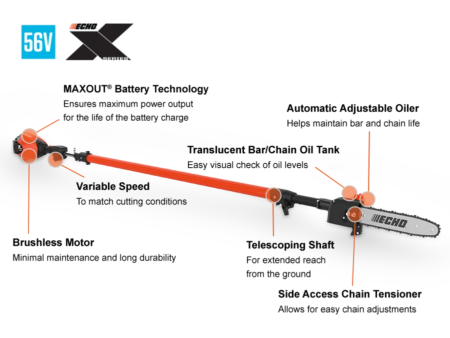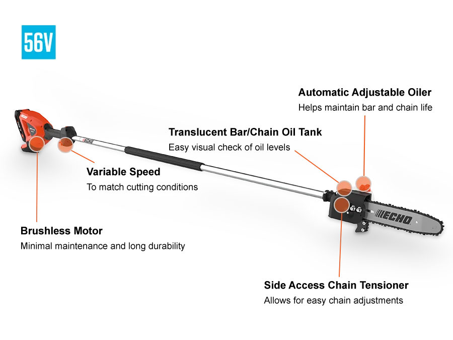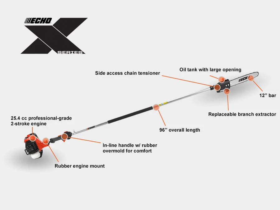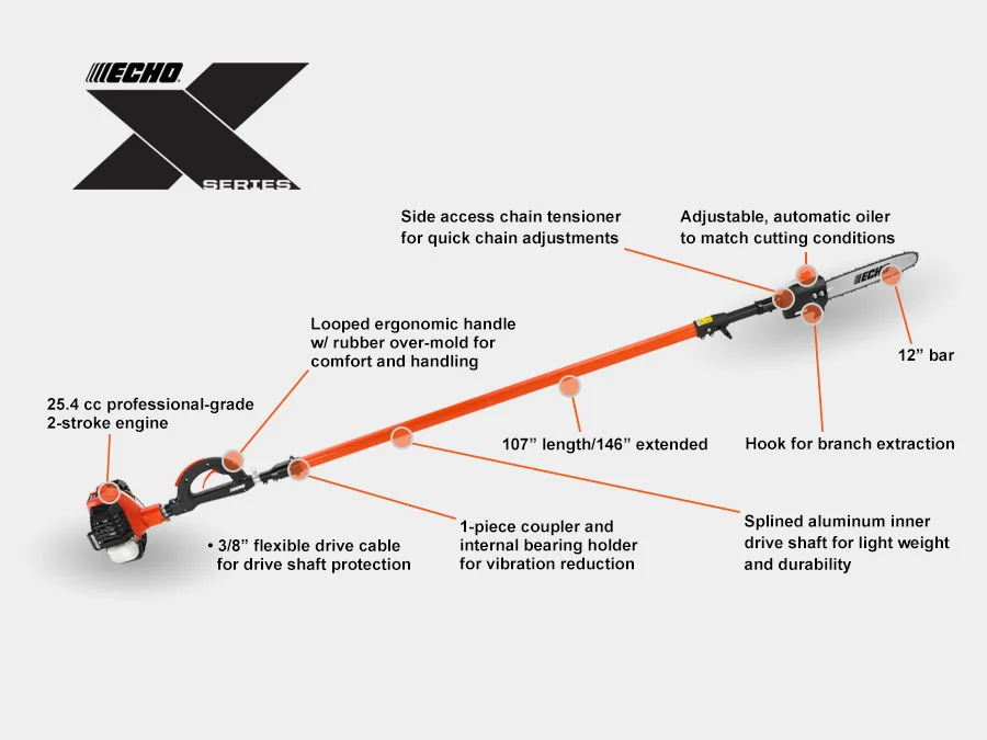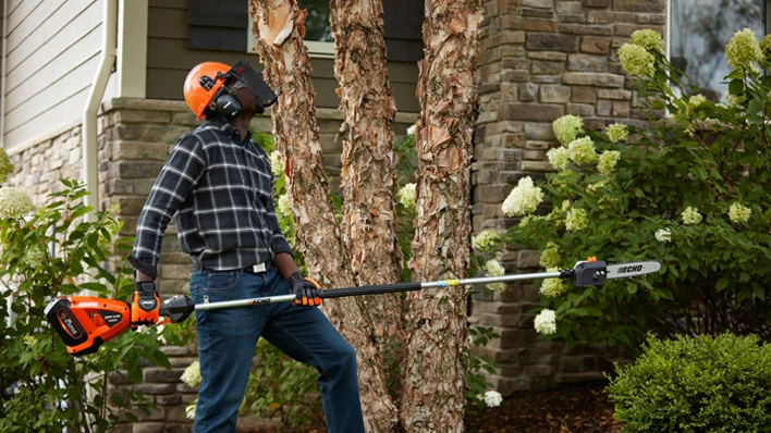 ECHO pole pruners provide extended reach for trimming tall branches and shrubs, easily cutting wood up to 3 inches in diameter. Lightweight and easy to use, these tools are ideal for both professionals and homeowners, featuring design elements that maximize efficiency, safety, and precision. Telescoping or fixed shaft options allow you to work comfortably at various heights without the need for a ladder. Ergonomic controls, balanced construction, and reduced vibration help minimize fatigue during extended use. With reliable engines or battery-powered options and durable cutting components, ECHO pole pruners deliver consistent, clean cuts season after season.