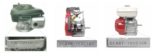 The Honda engine serial number is stamped into the side of the engine. All Honda engine serial numbers include a 4 or 5-letter prefix, followed by a 7-digit number.