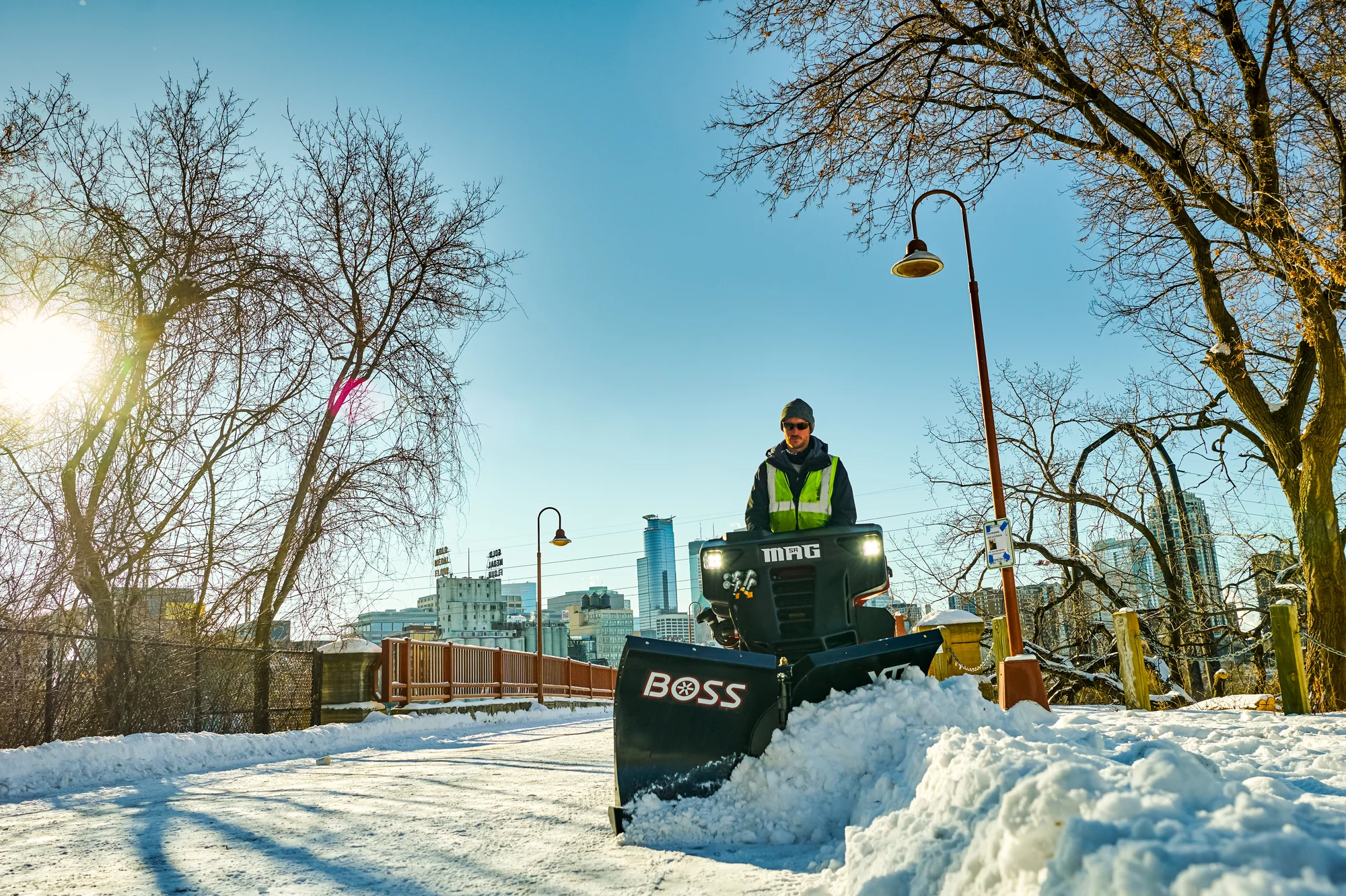 The SR Mag integrates seamlessly into professional snow removal fleets, providing a dedicated sidewalk solution that complements trucks, plows, and larger snow equipment for complete property coverage.