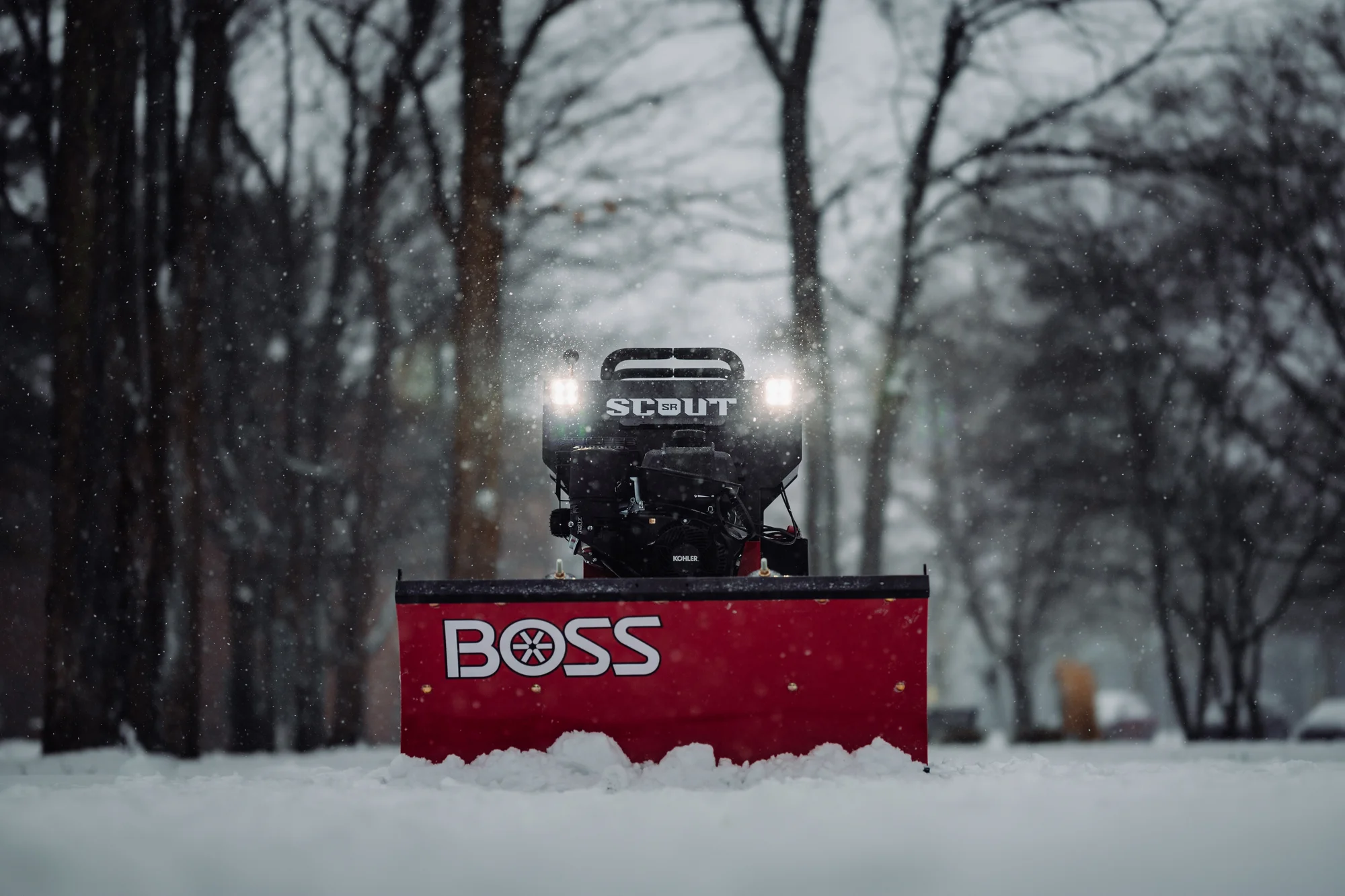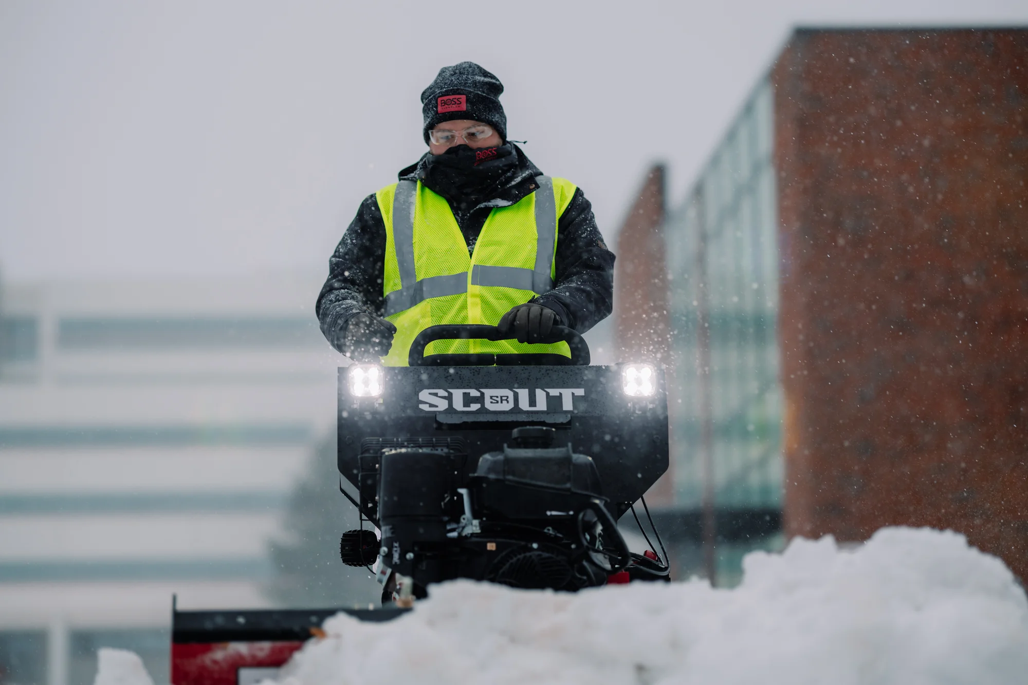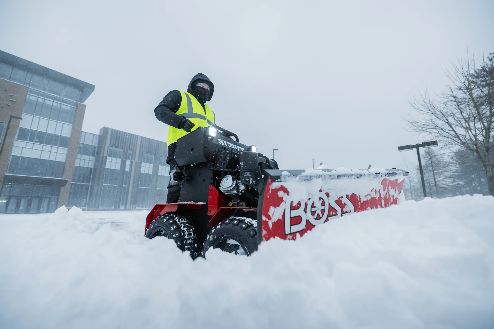 The BOSS Scout is purpose-built for clearing sidewalks, pathways, and tight pedestrian areas. Its compact footprint allows operators to efficiently navigate narrow spaces where larger equipment cannot operate.