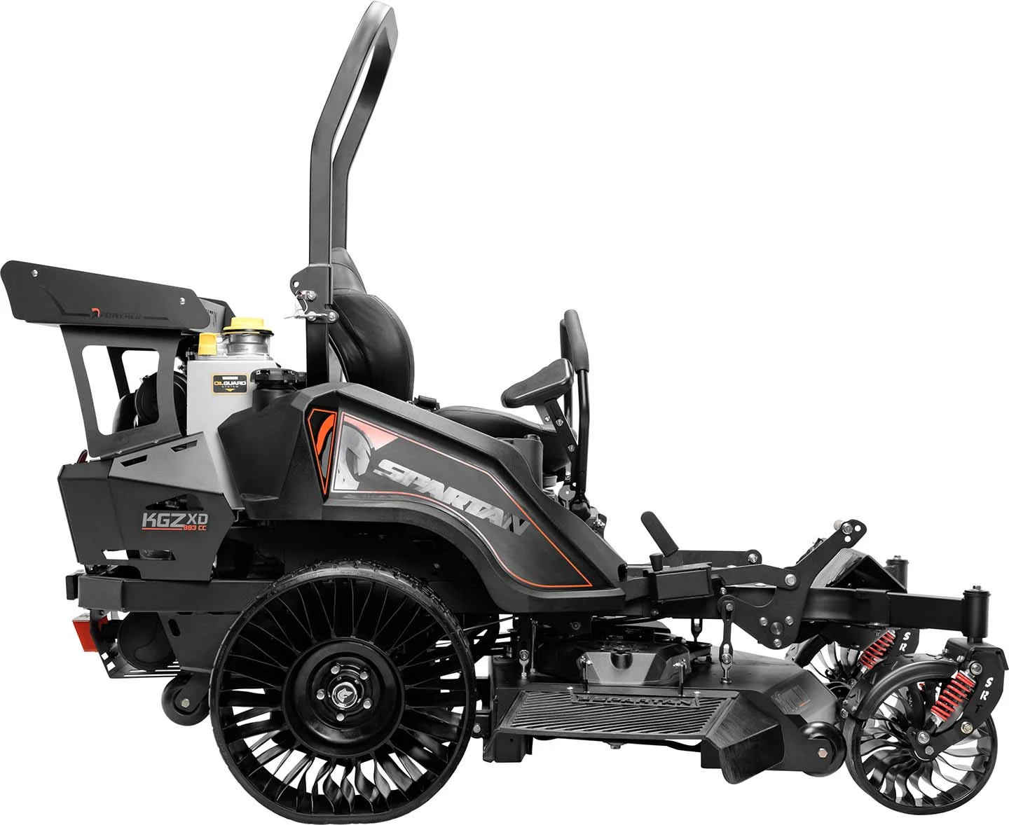 Spartan KGZ-XD Zero Turn Rider RSKXD161994VO sets the bar for premium mowing performance with a large 61 inch cutting deck, 17 gallon fuel tank capacity, and adjustable lap bars for added comfort. Built with commercial-grade components, advanced suspension, front and rear tweels for unmatched traction, and a powerful Vanguard engine, the KGZ-XD delivers exceptional speed, handling, and cut quality across large turf areas. Its ergonomic design and full suspension provide comfort on long mowing days, while rugged fabrication ensures durability season after season.